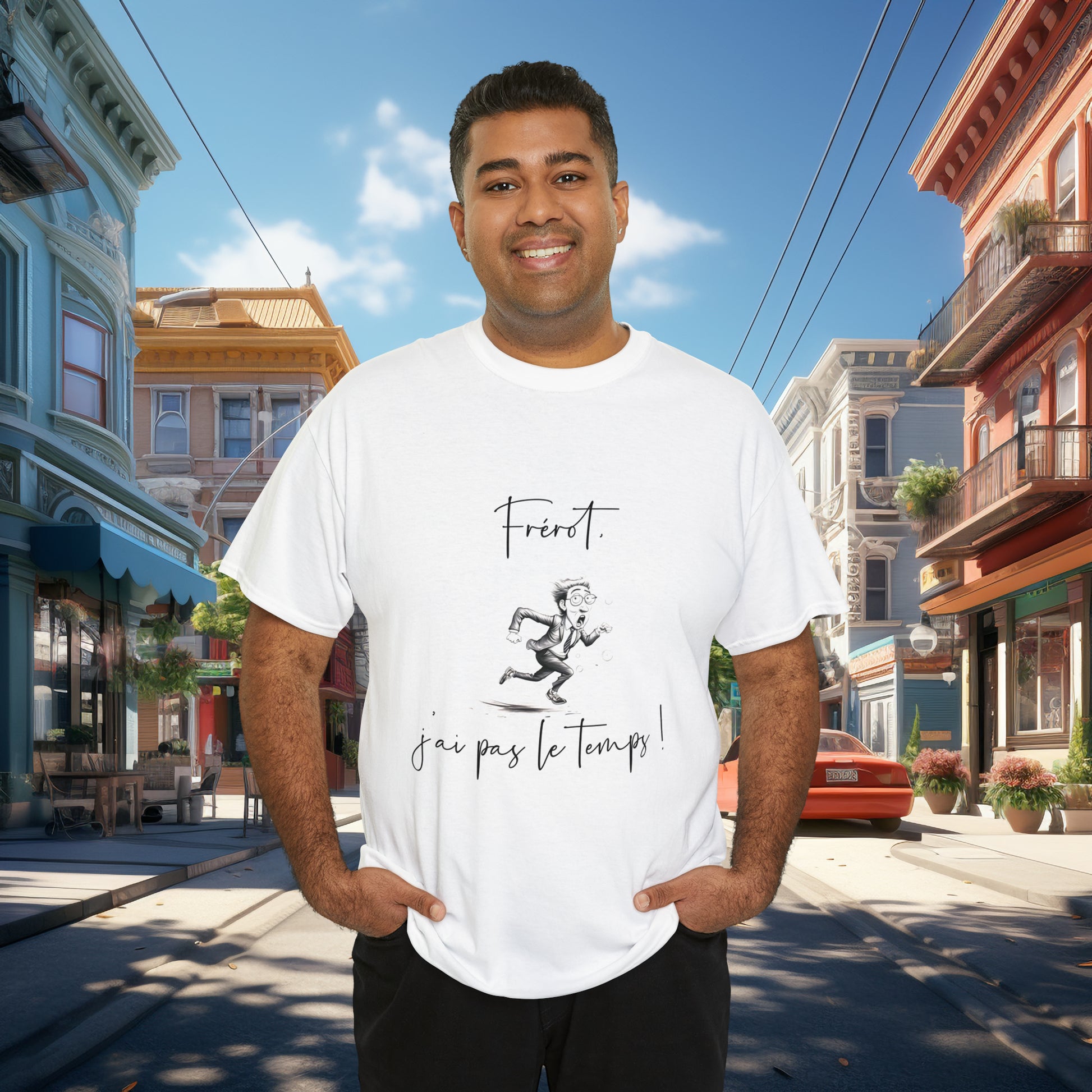 Exprimez votre humeur et votre personnalité avec notre t-shirt unisexe 'Frérot, j'ai pas le temps', une pièce essentielle de la collection de vêtements humoristiques conçus en France par SeeBlings. Ce t-shirt en coton épais est plus qu'un simple vêtement ; c'est une déclaration de style décontractée.
